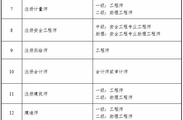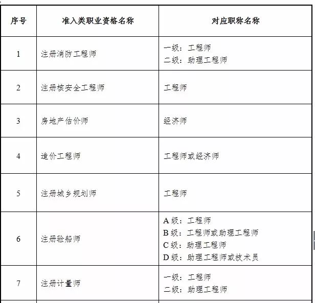 一、通过全国统一考试,取得注册消防工程师、注册核安全工程师、房地产估价师、造价工程师、注册城乡规划师、注册验船师、注册计量师、注册安全工程师、注册测绘师、注册会计师、注册建筑师、建造师、勘察设计注册工程师等13项准入类职业资格证书的专业技术人员,其职业资格直接对应相应系列和层级的职称(见附件),两者享有同等效力。