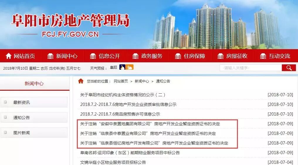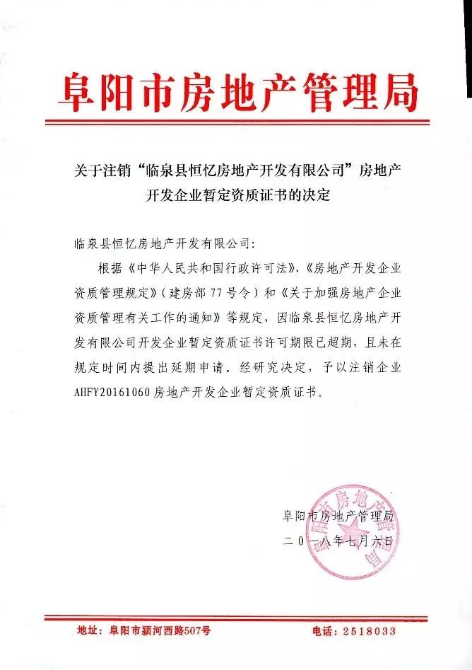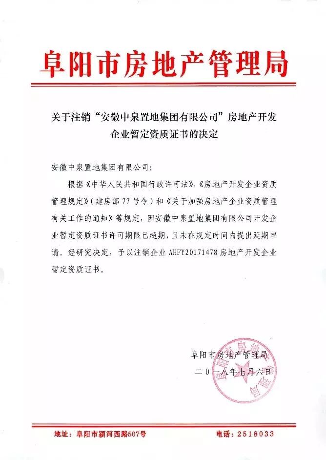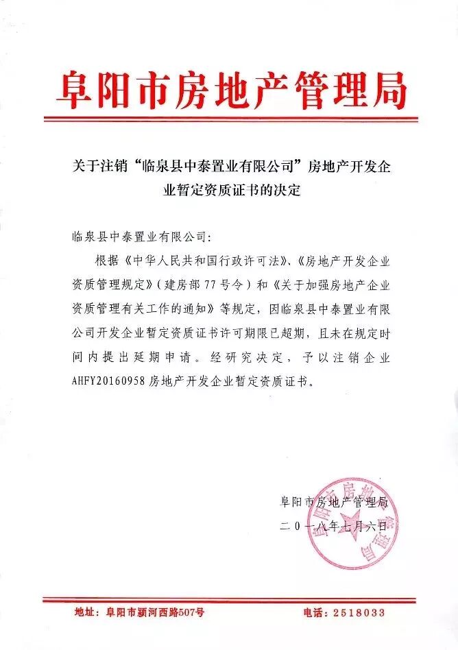 2018年7月9日,阜阳市房产局又公布了3家阜阳房企被注销资质:分别是中泉置地集团有限公司、临泉县中泰置业有限公司、临泉县恒忆房地产开发有限公司。