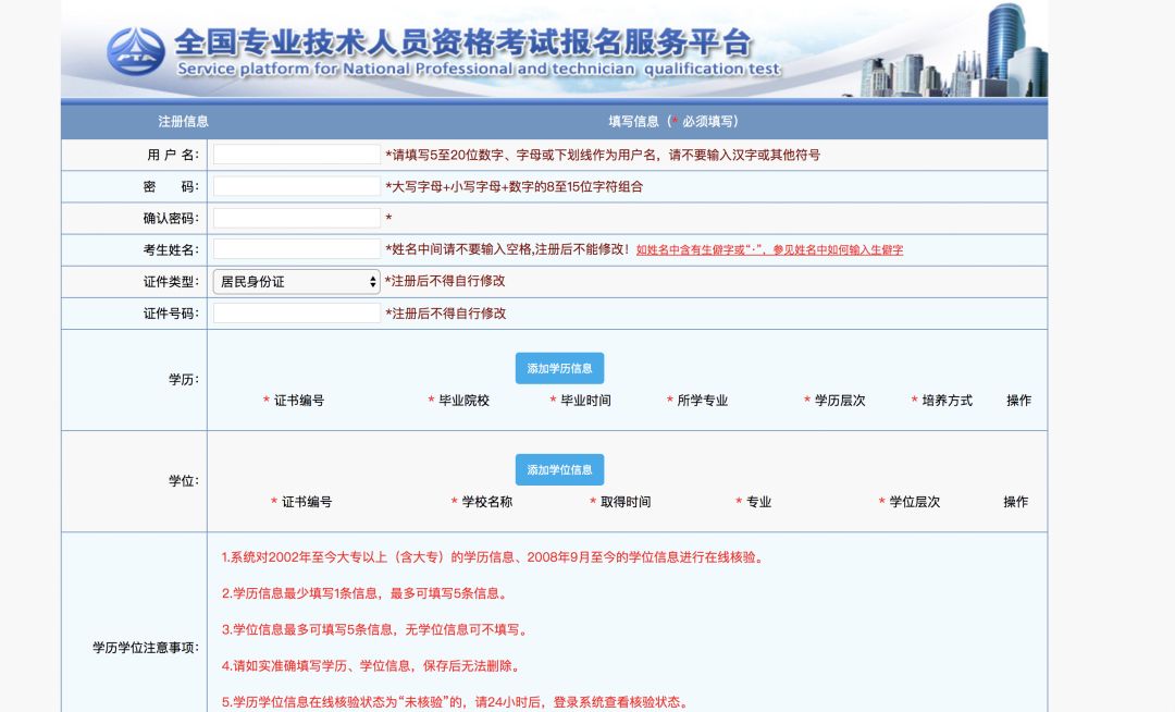 1.人员必须先进行注册,注册后系统将对身份、学历学位、所学专业等信息进行在线核验,核验通过才能进行报名操作;